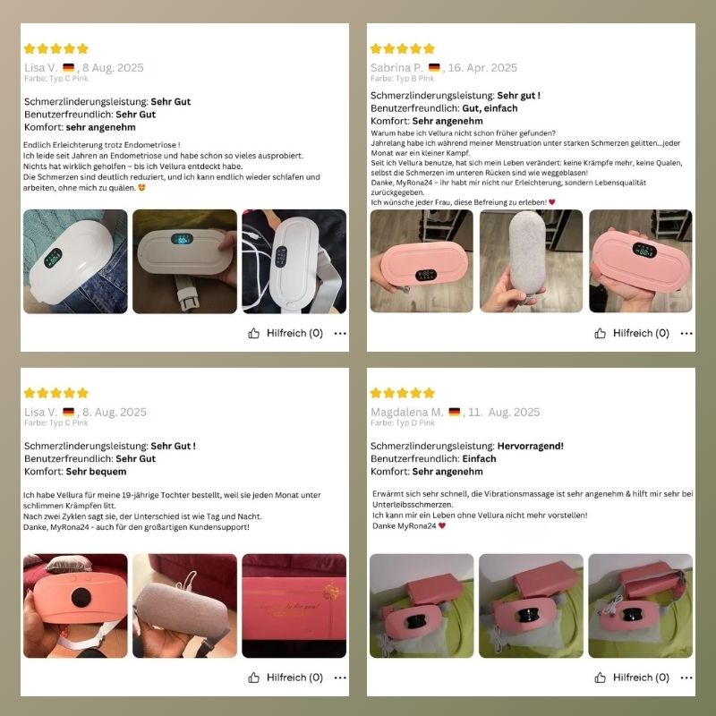 Ich habe meine Periode erst seit 2 Jahren und hatte jedesmal schlimme Schmerzen, dass ich in der Schule kaum sitzen konnte 😅 Meine Mama hat mir Vellura gekauft und es hilft richtig! Es wird total schnell warm und diese Vibration ist mega angenehm. Viel besser als eine Wärmflasche.